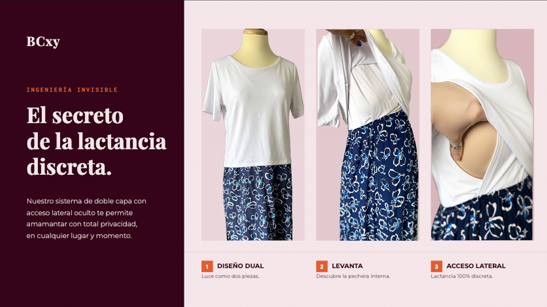 Hemos diseñado un sistema de lactancia de doble capa con acceso lateral. Funciona con la fluidez de un solo movimiento, paso a paso: