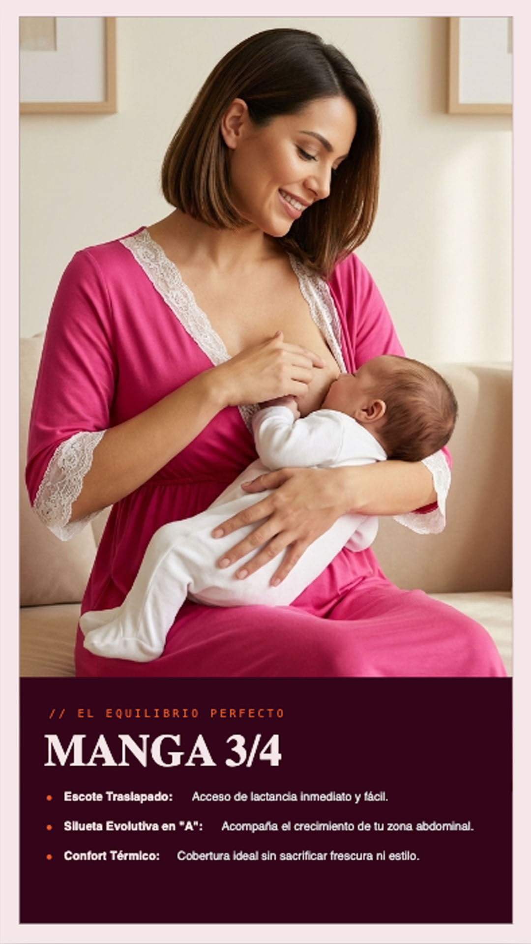 Vestirte en el postparto o durante el embarazo jamás fue tan fácil. El Camisón Maternal Serie Balance 3/4 es la pieza clave que no puede faltar en tu maleta de clínica ni en tus madrugadas en casa.