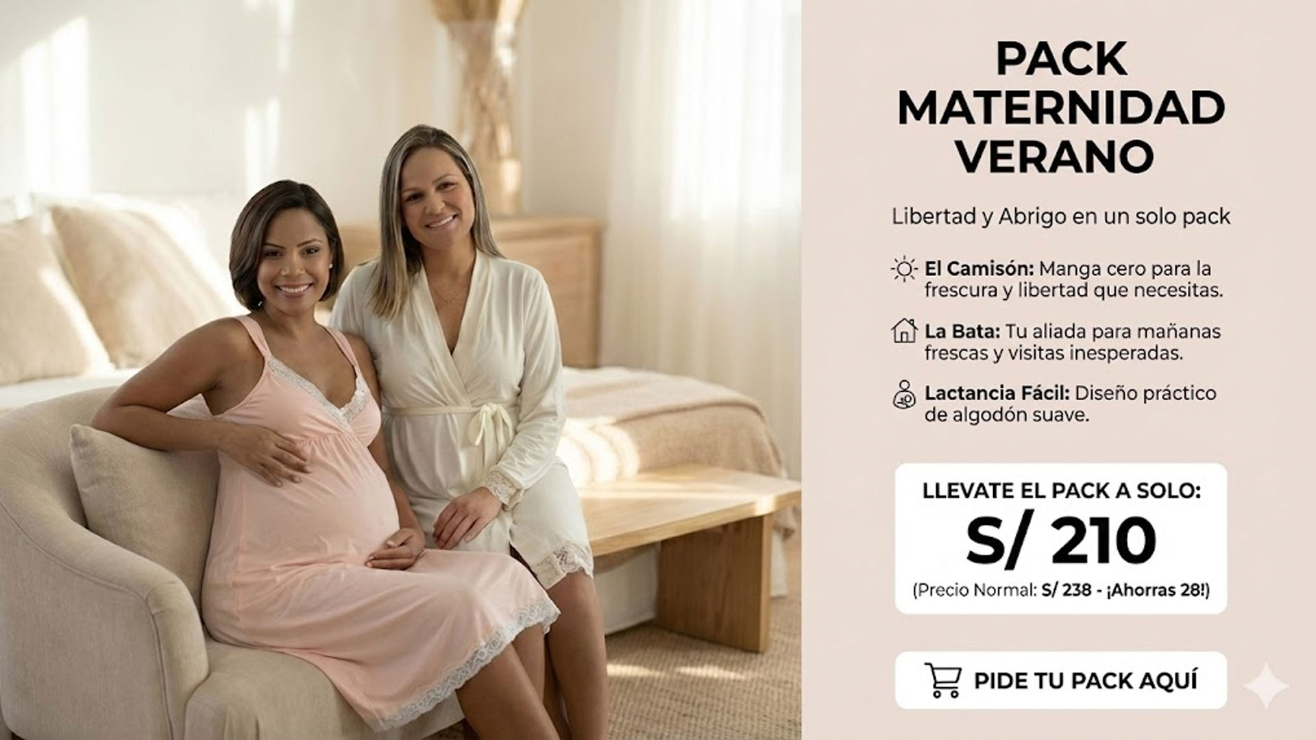 Precio Especial: Llévate el Pack (Camisón + Bata) por solo S/ 210 (Precio normal S/ 238). ¡Estás ahorrando S/ 28 que puedes usar en pañales o un capricho para ti!