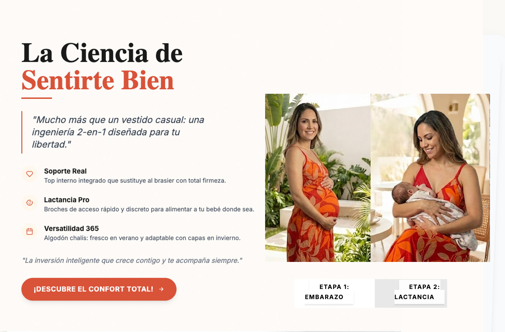 La magia de este vestido está en su interior. Cuenta con un top de soporte interno confeccionado en algodón reforzado que sostiene el busto con firmeza. Olvídate de los brasieres de lactancia incómodos y de las tiras que se marcan; nuestra ingeniería te da la seguridad que necesitas para sentirte libre y ligera.